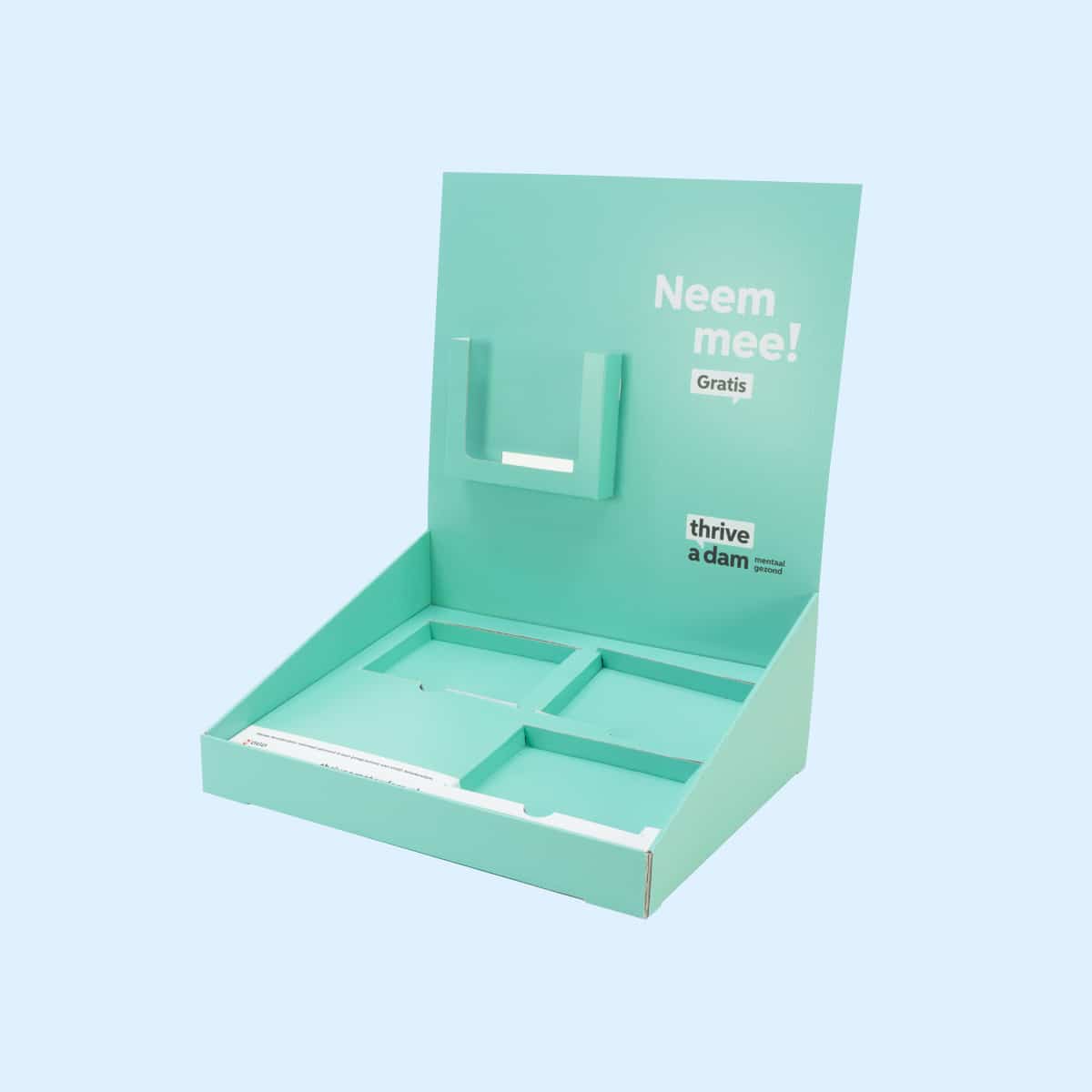 Bij ons zijn toonbankdisplays verkrijgbaar in verschillende standaardformaten, zoals A4 en A5, maar we bieden ook maatwerkopties aan. Dit betekent dat het formaat, ontwerp en materiaal volledig kunnen worden afgestemd op jouw product. Door dit op maat gemaakte ontwerp kunnen displays optimaal worden benut, zonder verspilling van ruimte, en wordt jouw product op een aantrekkelijke manier gepresenteerd. Daarnaast bieden we creatieve oplossingen, zoals vakjes voor folders, podiums voor extra presentatie en compartimenten voor meerdere items.